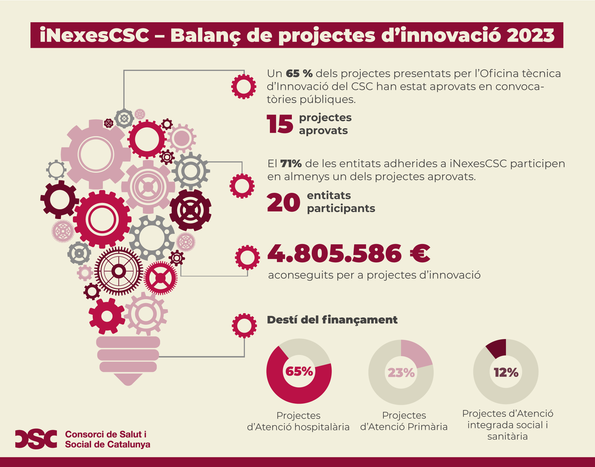 El hub d’innovació del Consorci de Salut i Social de Catalunya (CSC), iNexesCSC, va aconseguir, durant el 2023, 4.805.586 € de finançament per a projectes innovadors en l’àmbit de l’atenció sanitària i social. Dels 23 projectes que es van presentar des de l’Oficina Tècnica de Projectes d’innovació (OTPi) del CSC, 15 van ser aprovats en convocatòries públiques i 3 més es troben pendents de resolució. La majoria d’aquests projectes són multicèntrics i, en total, hi participen 20 entitats associades, que representen el 71% de l’ecosistema iNexesCSC.